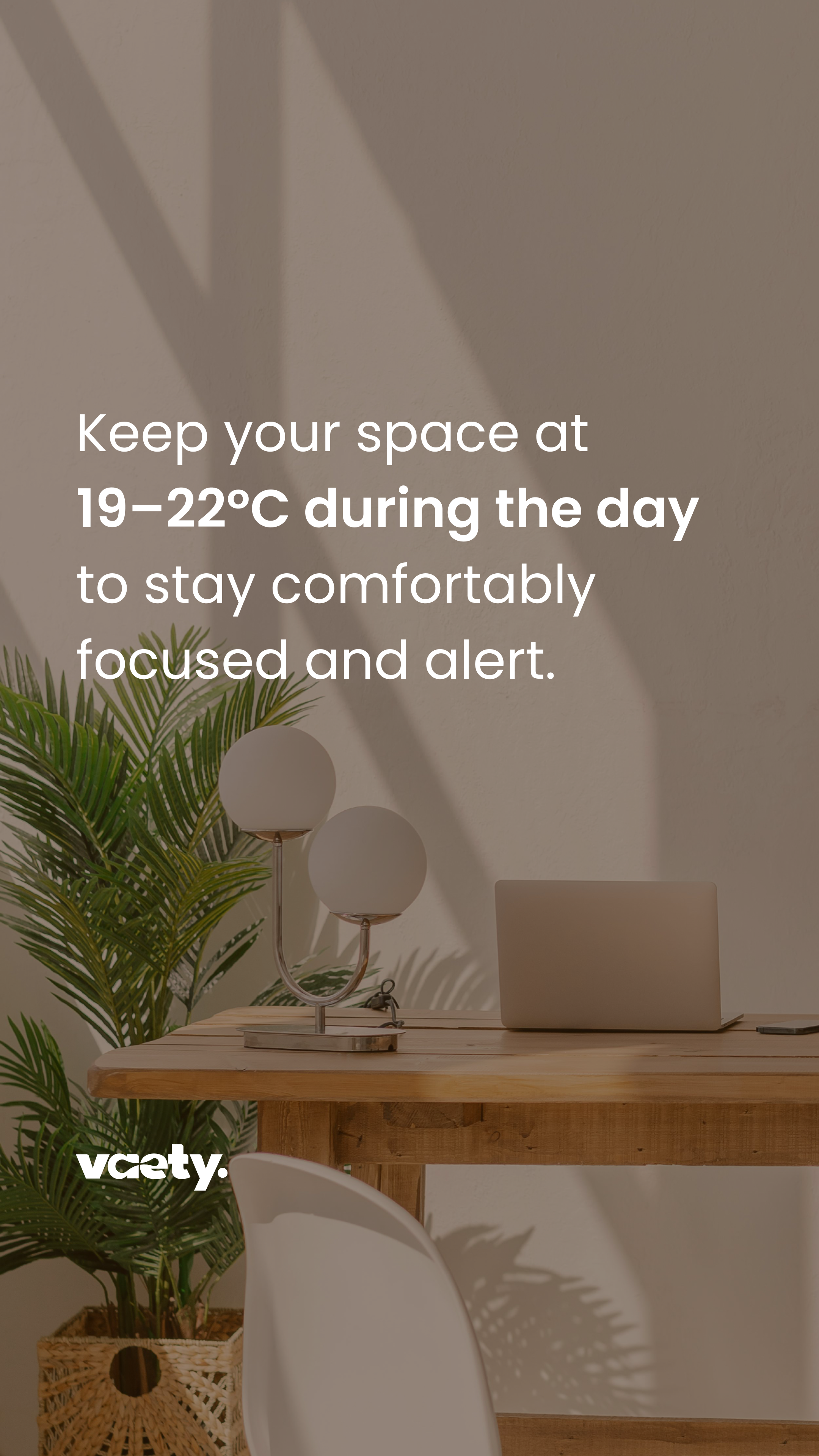 Keep your space at 19–22°C during the day to stay alert and productive. Your brain thrives in balanced, cool air.